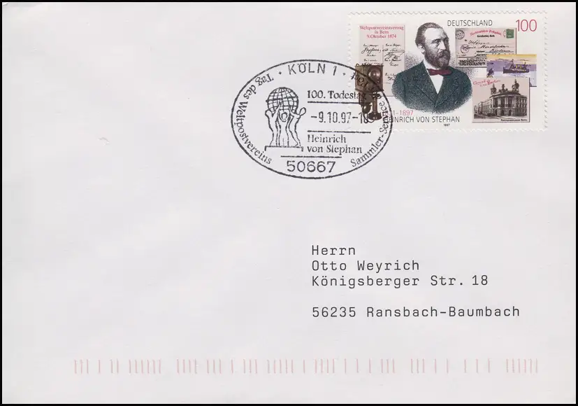 1912 Heinrich von Stephan, EF Lettre SSt Cologne Portrait & Mort & UPU 9.10.1997