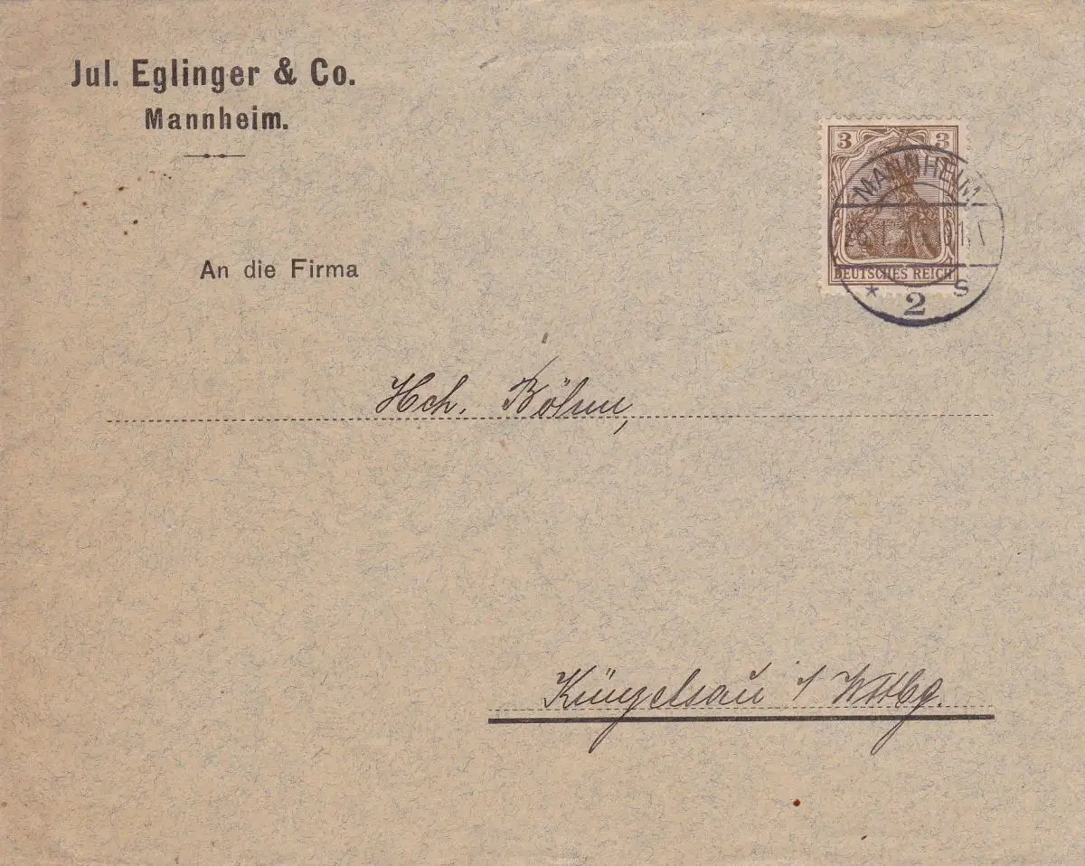 1914: Lettre de Mannheim à Künzelsau, affranchie par la machine à affûter