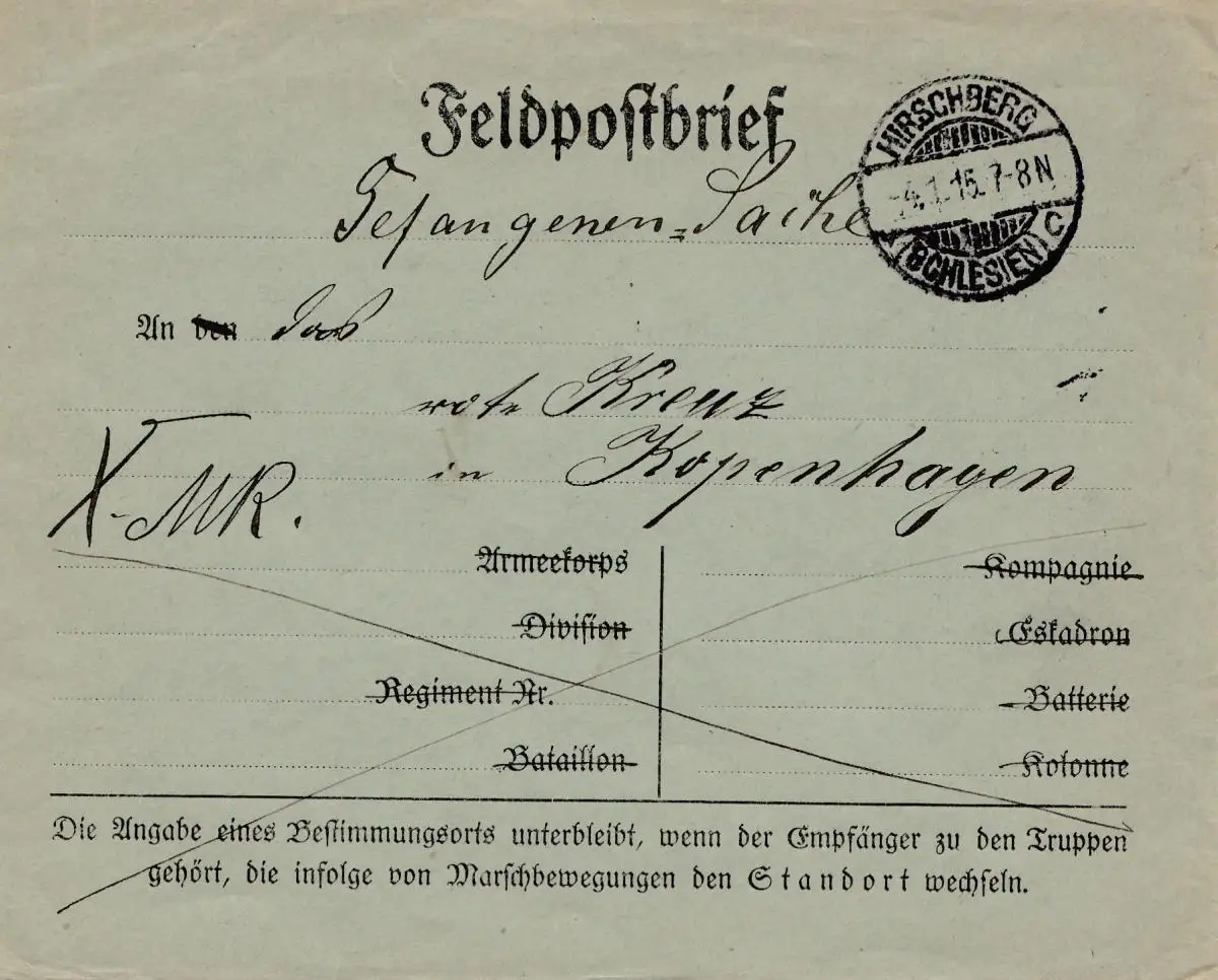 1915: Lettre de poste de Hirschberg à Copenhague