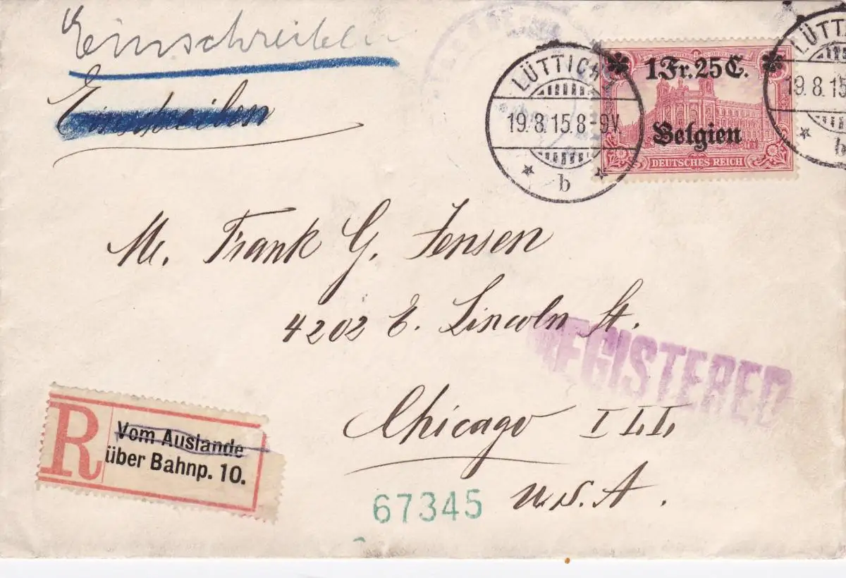 1915: Lettre recommandé Liège vers les États-Unis; numéro 8 EF