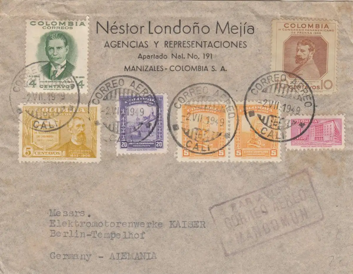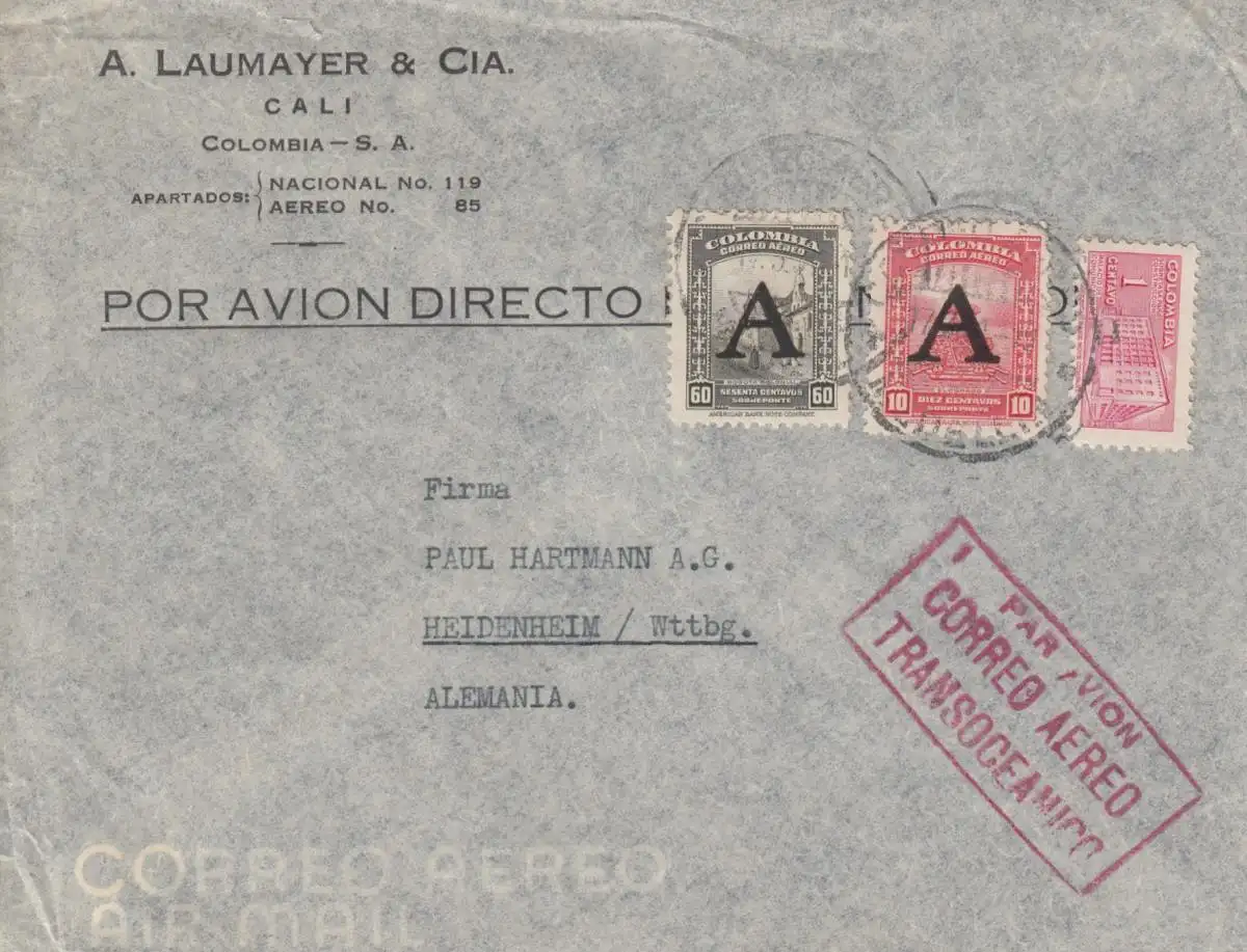 1919, letter from Manizales, Cali to Berlin/Heidenheim