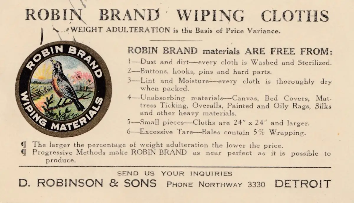 1923: États-Unis Detroit/Michigan: Robin Brand Wiping Cloths-Vogel/Bird