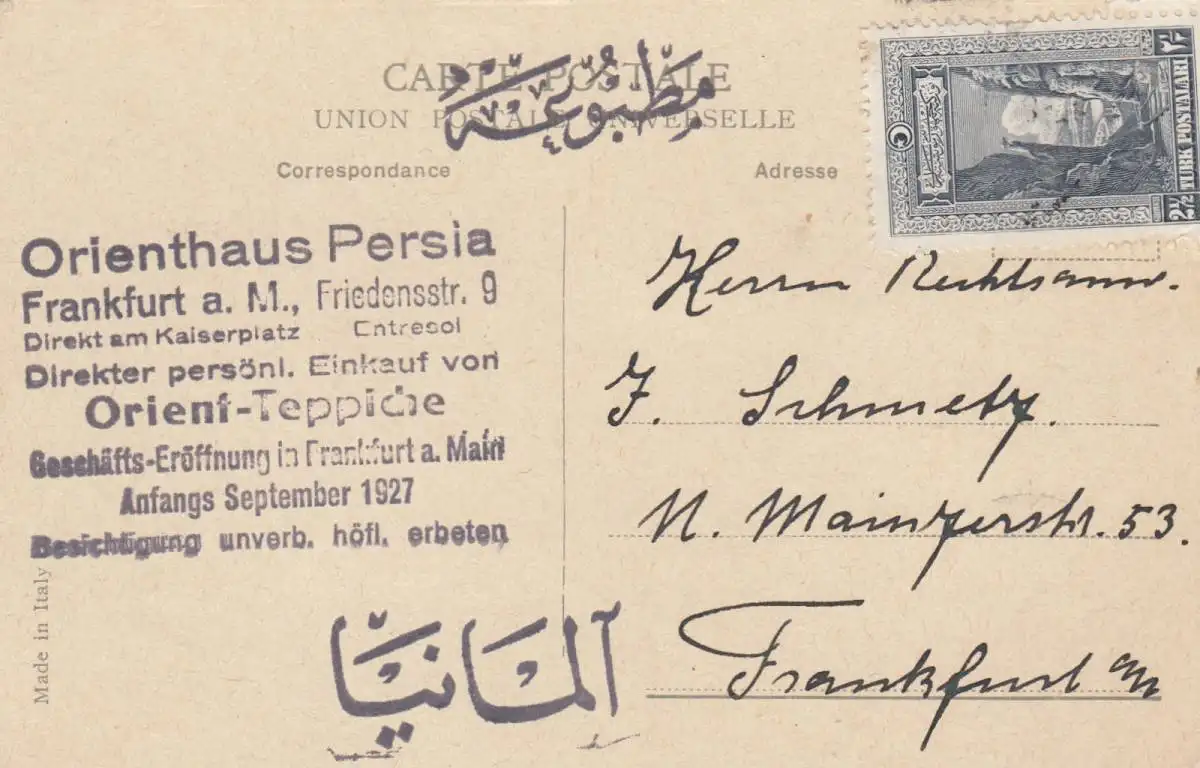 1927: Carte de vue Constantinople, Orient Tapis, Francfort/Main