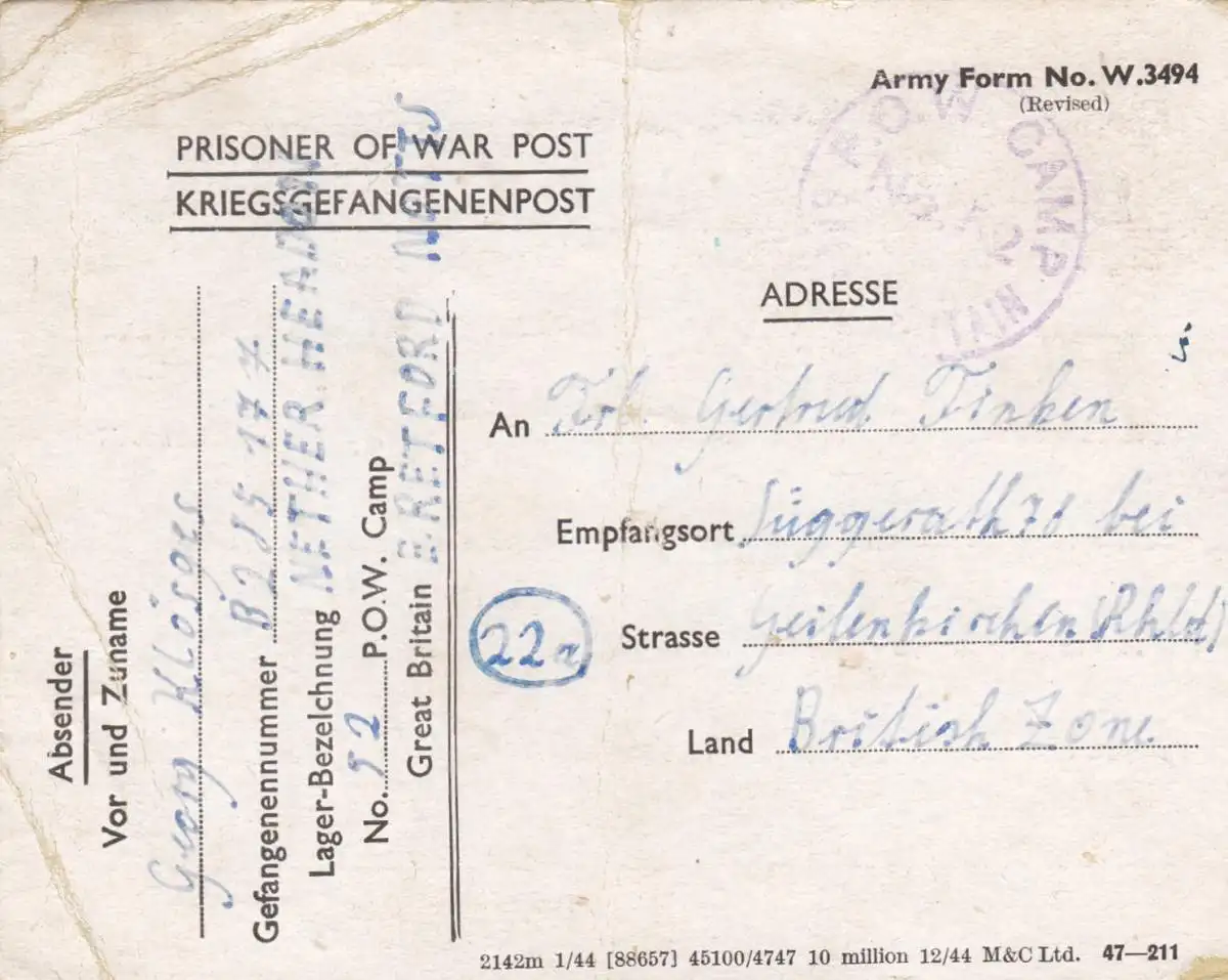 1940 PoW-Kgf Post, GB Eretford, to Gereniker