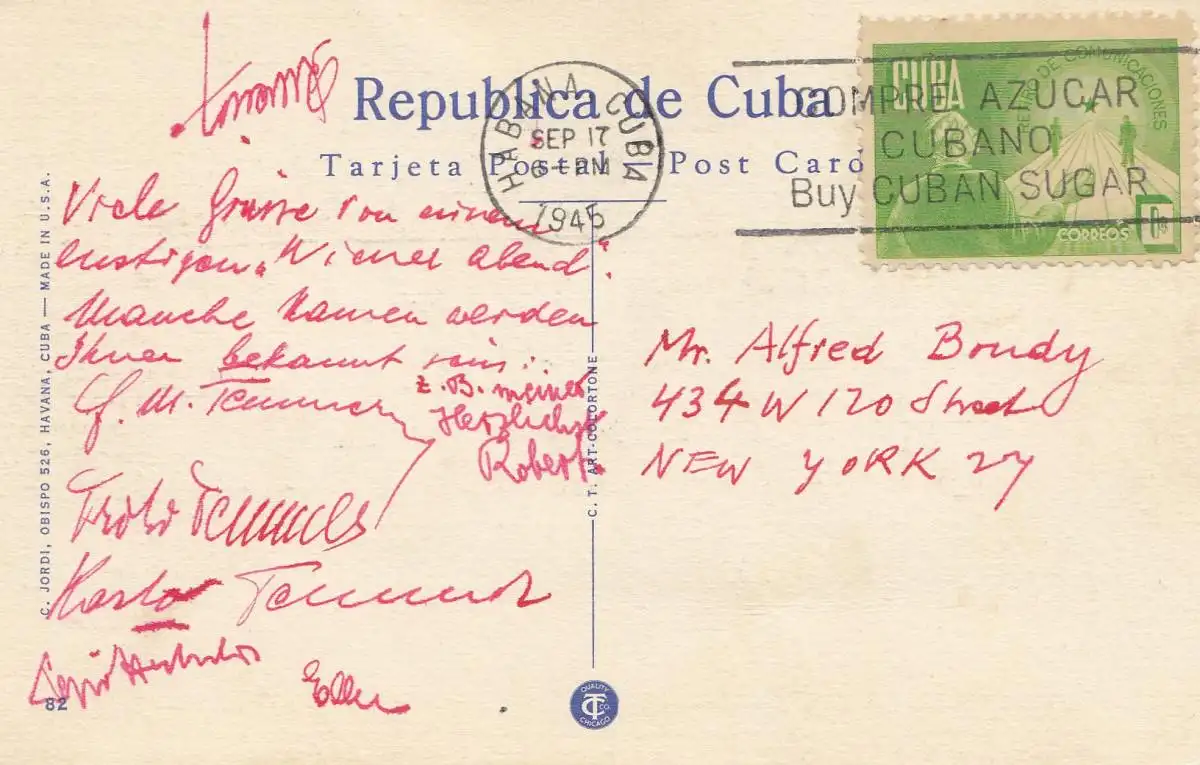 1945: Habana post card Marine Park to New York