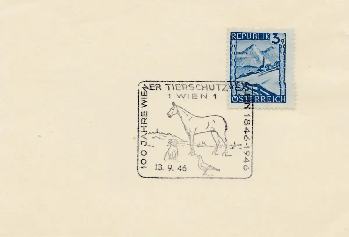 1946: Autriche: 100 ans de protection des animaux - cheval, chien, oiseau
