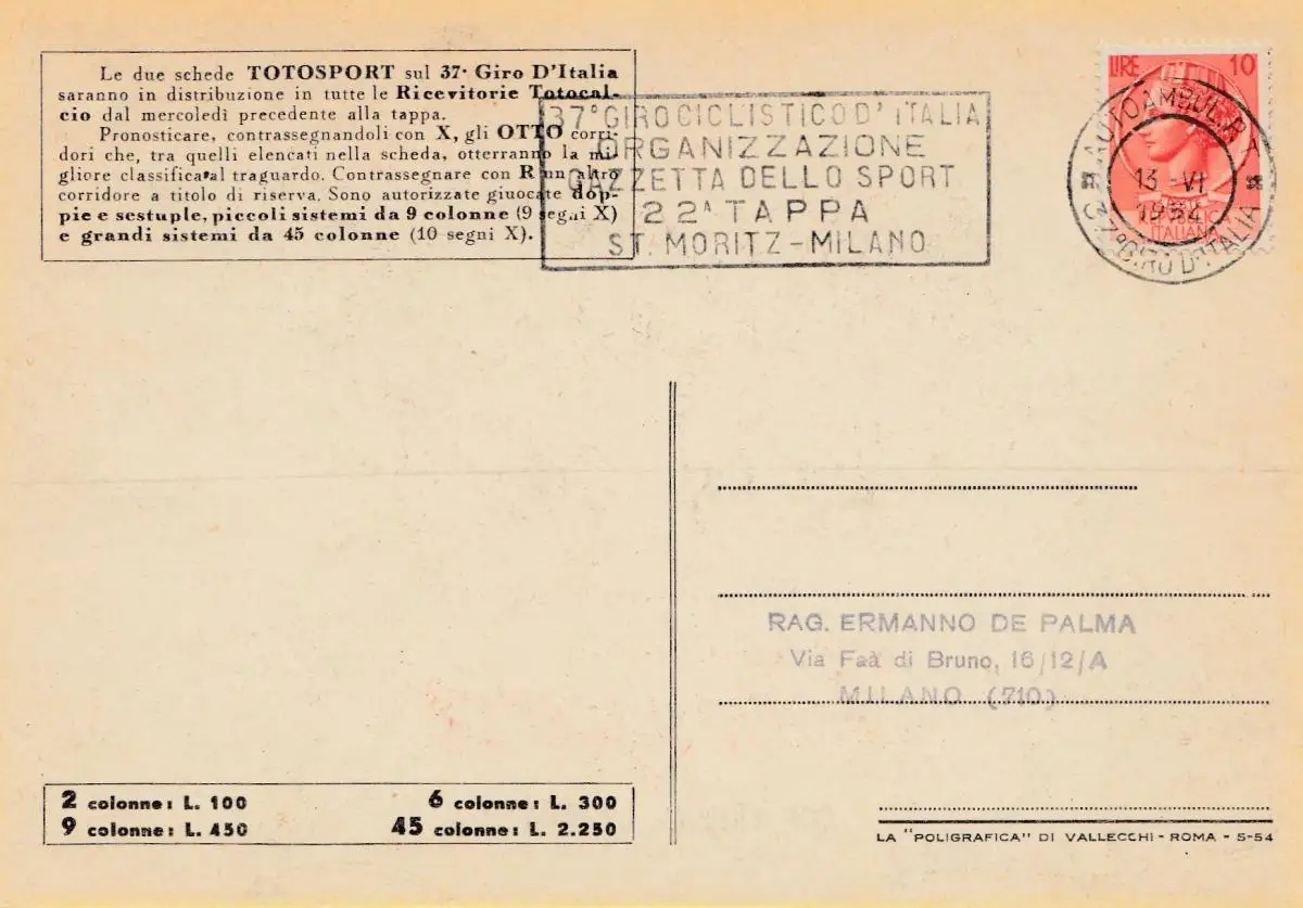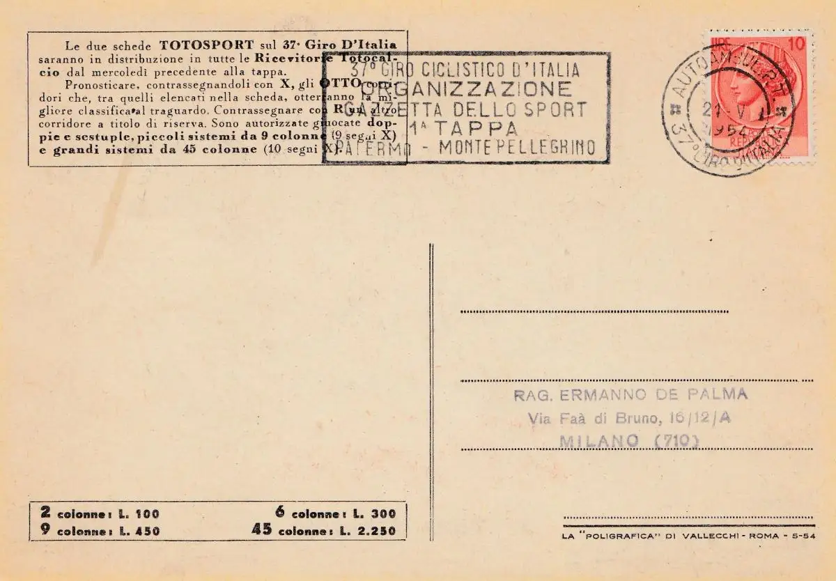 1954: Italie: Totosport: all 22 carts; 37. Giro D'Italia: 22 different cancels
