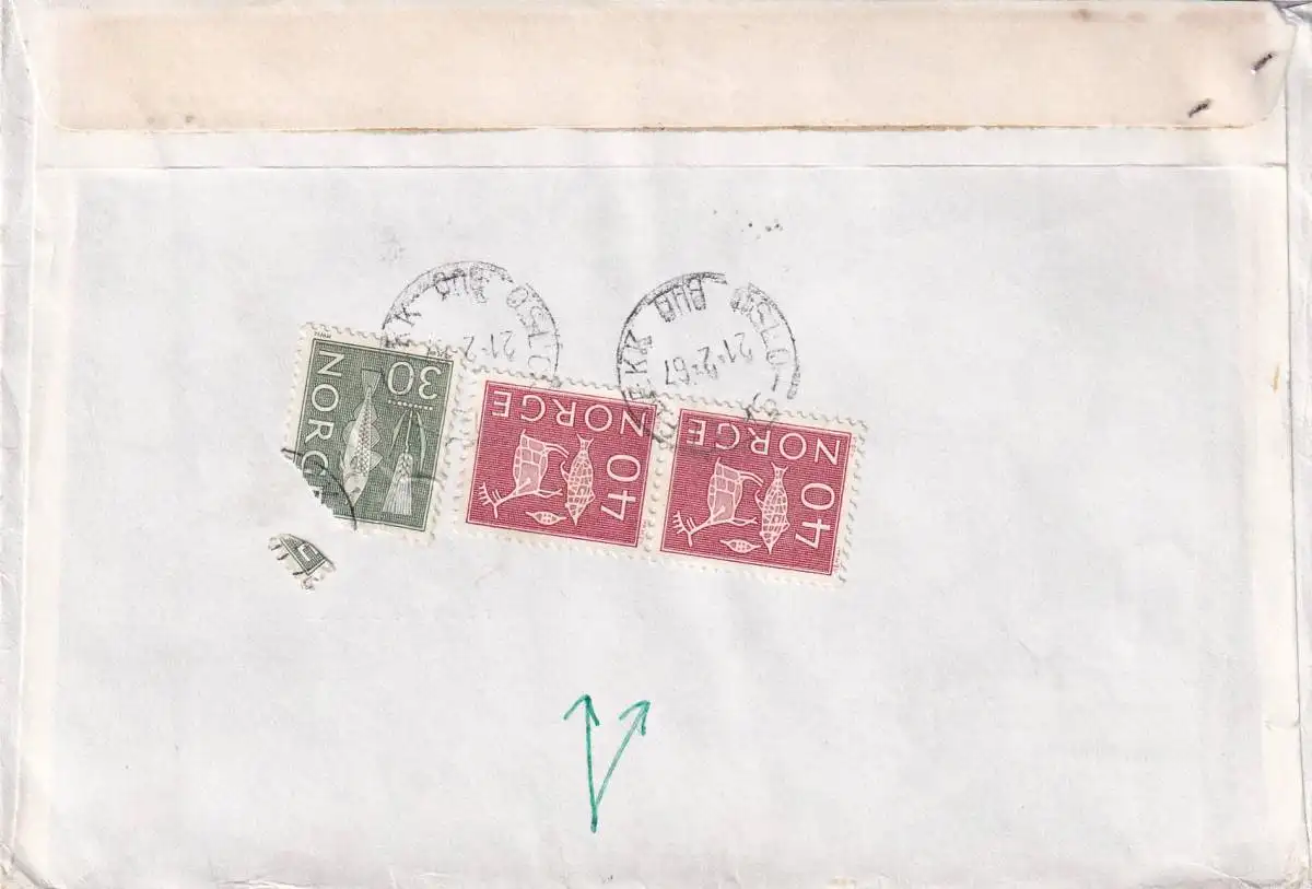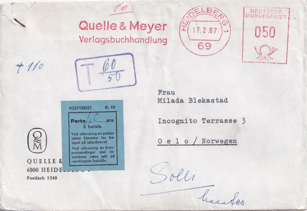 1967: Source&Meyer Verlag Heidelbergnach Oslo, Postporto en arrière franc