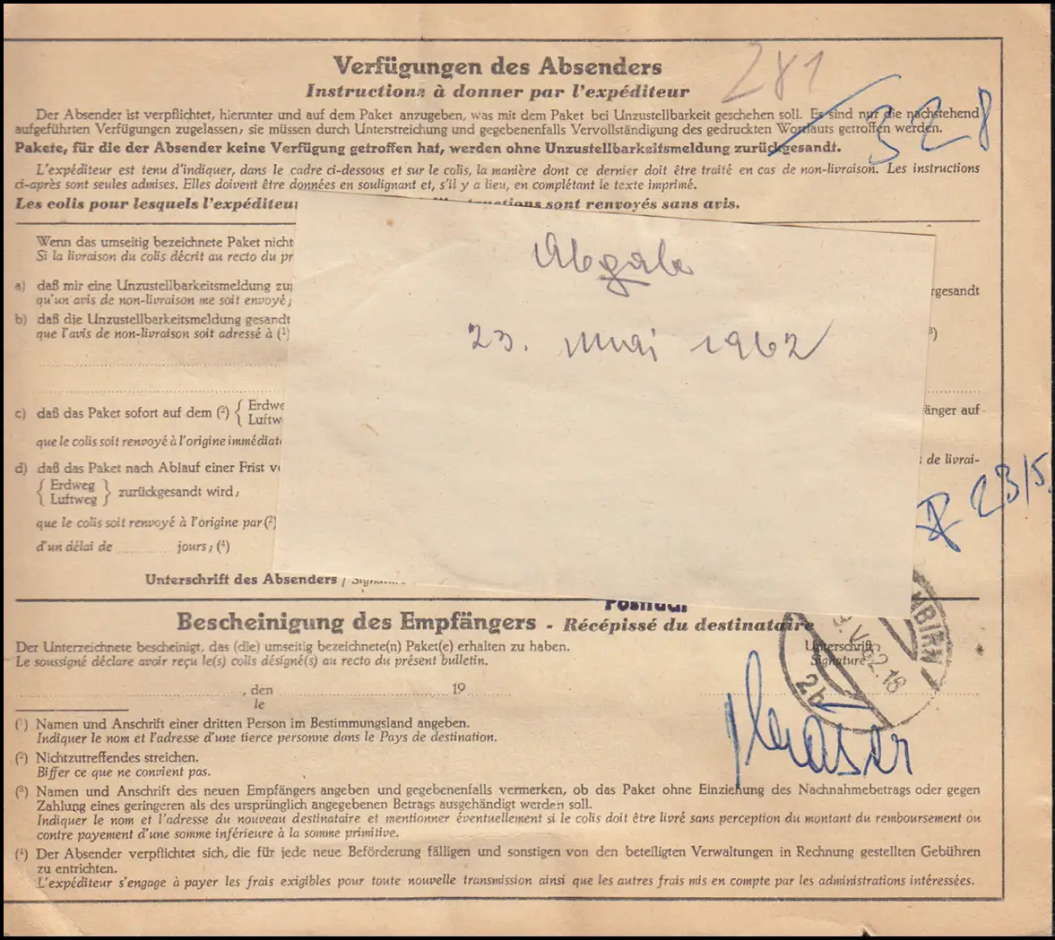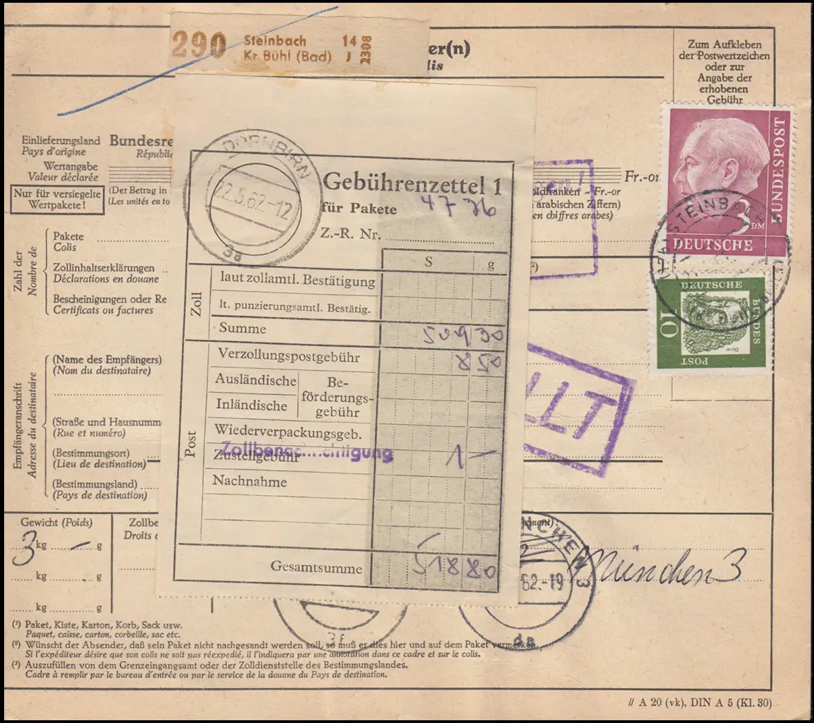 sur le bureau des douanes MUNICH 8.5.62 et INNSBRUCK 9.5.63, avec des feuilles de facturation collées. N° de catalogue: 196x+350x Contrôle: original Numéro d'article: 0000000002549>p>Note: Cet article n'est disponible qu'une seule fois. Vous recevrez exactement l'élément représenté.