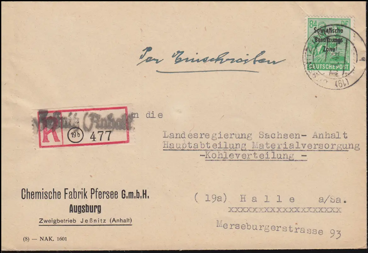 197 SBZ-Schref EF sur lettre R Not-R-Zerttel JESSNITZ (TENTION) 6.1.1949