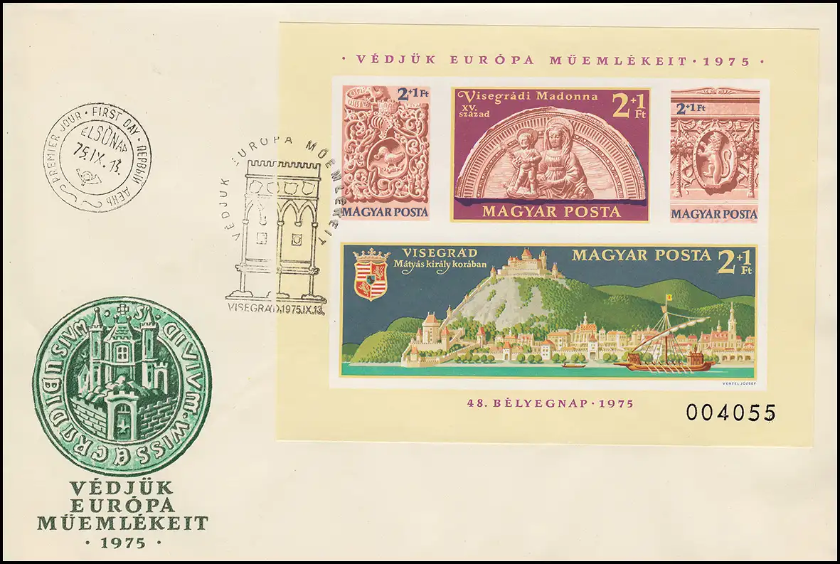 1975 Hongrie 3064-3067 bloc 115B Année de conservation des monuments, non-denté sur FDC
