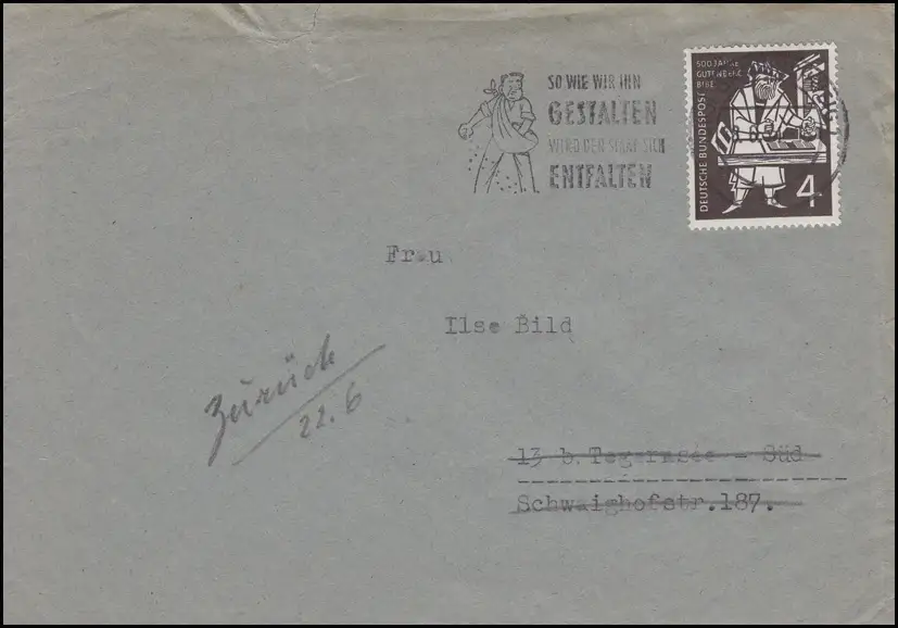 198 Bible de Gutenberg 4 Pf. EF Chose à imprimer BRAUNSCHWEIG 18.6.54 vers Tegernsee