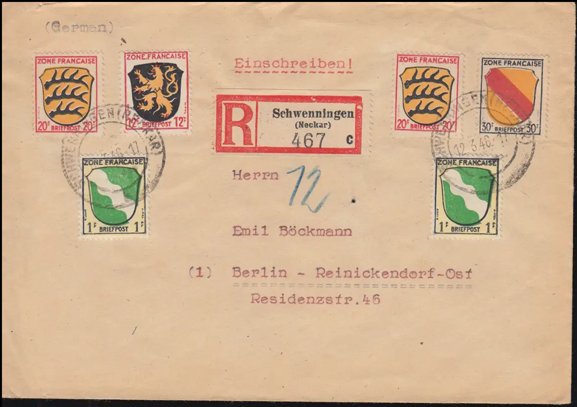 1ff francs blagues R-lettre SCHWENNINGEN (NECKAR) 12.3.46 vers BERLIN 21.3.