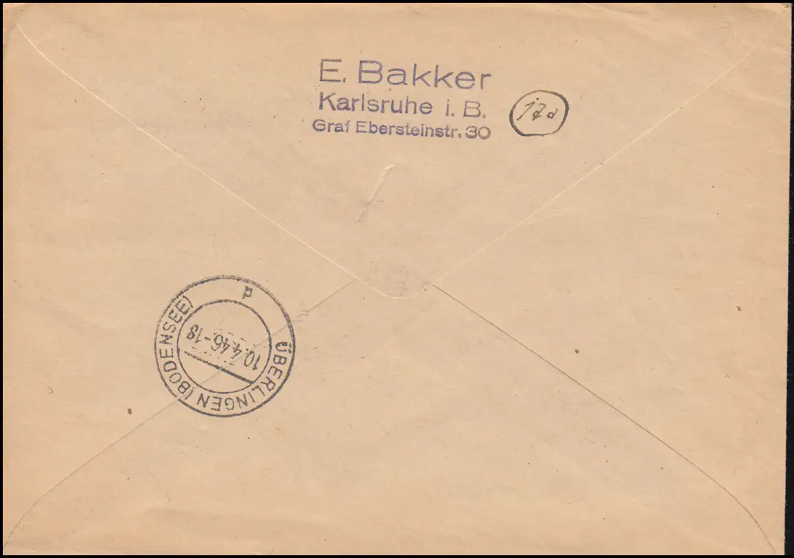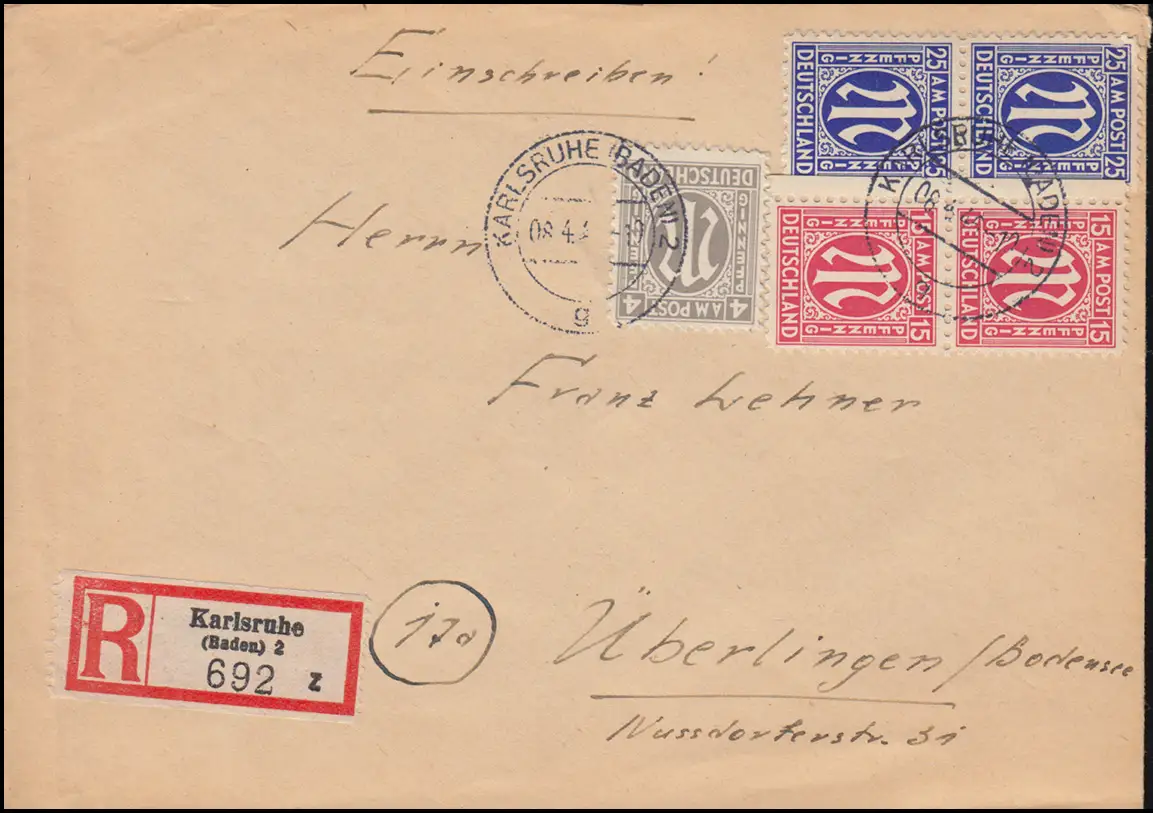 2+8+9 AM Post MiF sur lettre R de KARLSRUHE (BADE) 8.4.1946 après AUVERLINGEN 10.4.46
