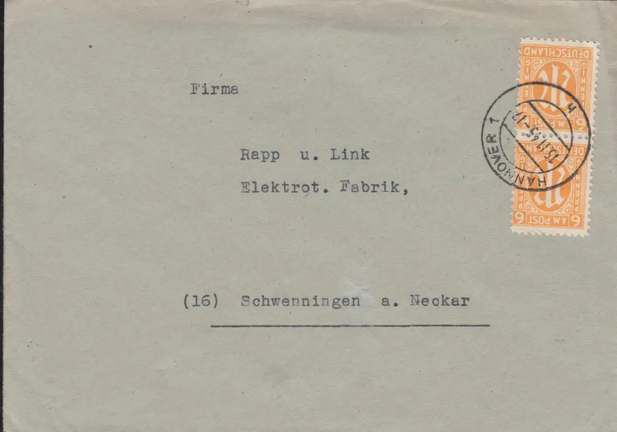 20 AM-Post 6 Pf. comme MeF sur lettre HANNOVER 15.11.1945 après Schwenningen/Neckar