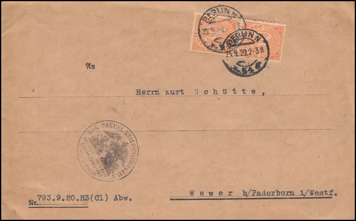 20 MeF sur lettre Ministère de la Guerre BERLIN 25.9.1920 à Wewer