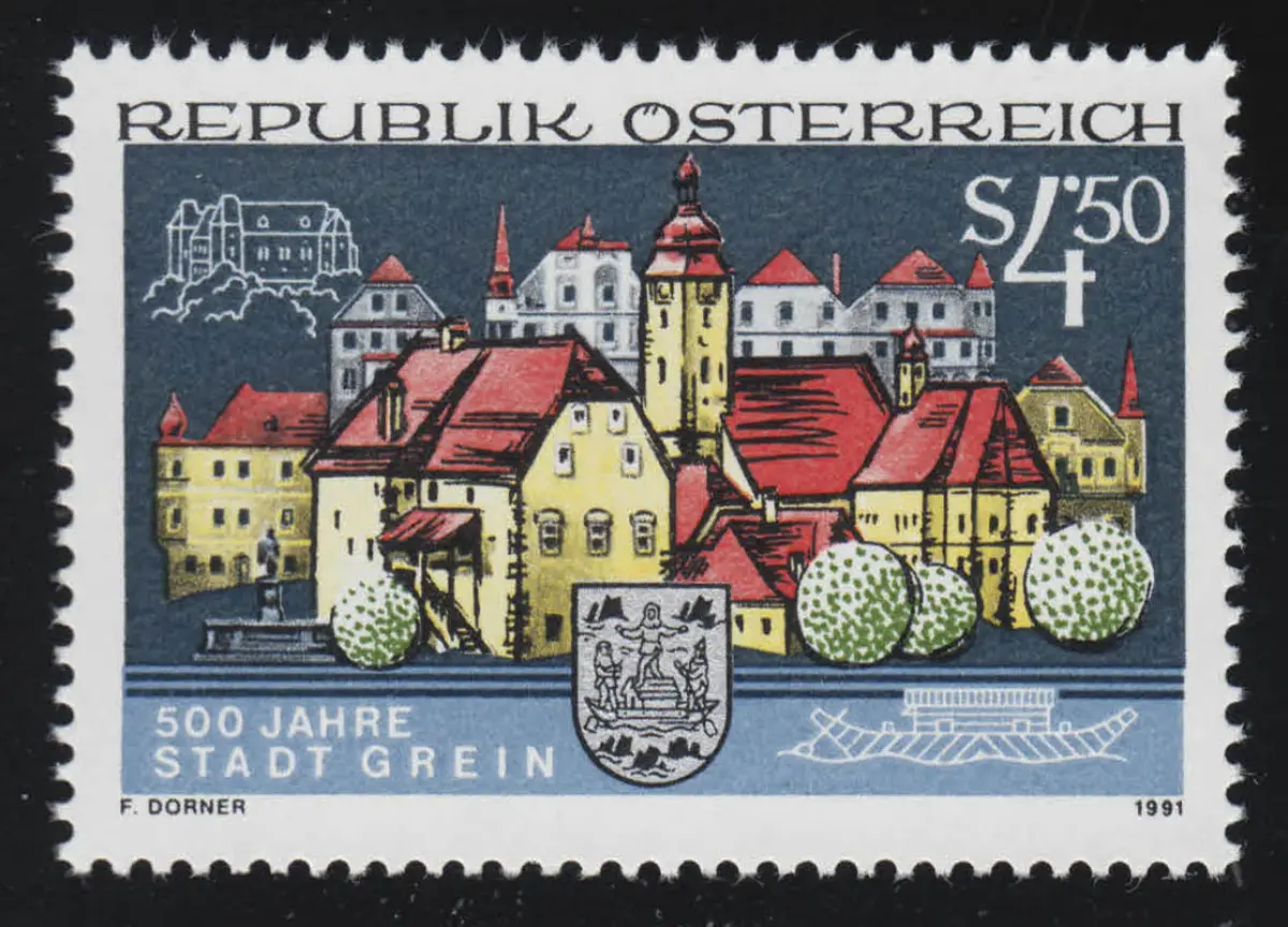 2030 500 ans Ville de Grein, vue de ville , armoiries de la ville, 5 S, frais de port **