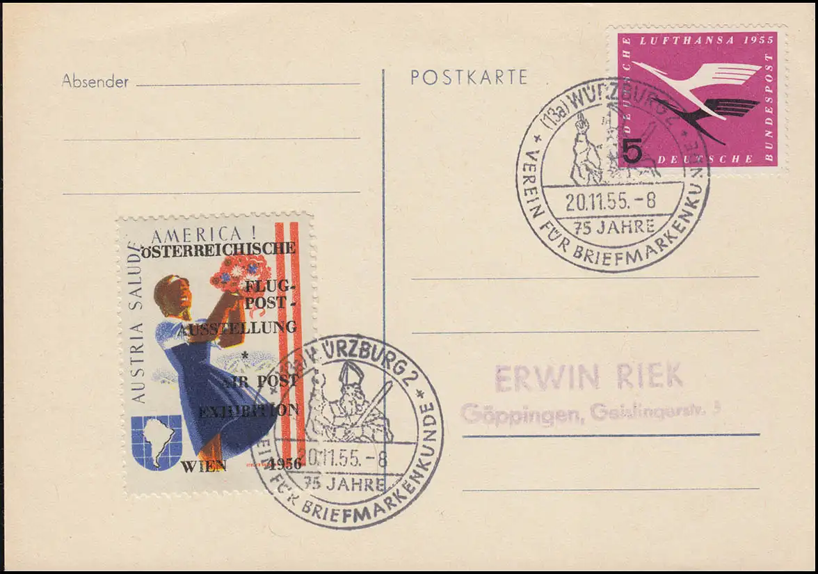 Vignette "Salon autrichien du courrier aérien AIR POST EXHISION Vienne 1956" et cachet spécial "WÜRZBURG 75 ans Association pour les timbres 20.11.1955," empreintes de faux vers l'arrière sur la carte Numéro de catalogue: 205 Examen: original Numéro d'article: 00000000033788>p>Remarque: Cet article n'est disponible qu'une seule fois. Vous recevrez exactement l ' article illustré.