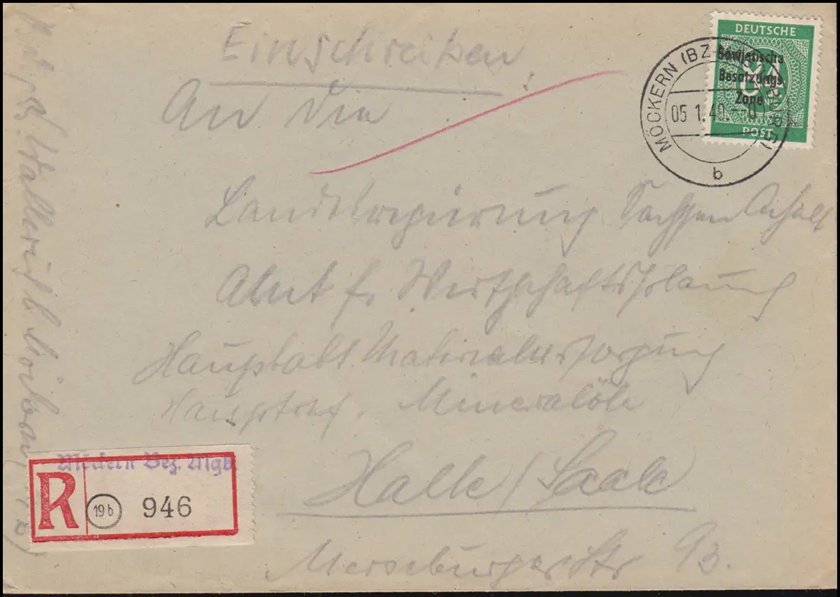 211 Imprime SBZ en tant qu'EF sur lettre R de Not-R-Zettel MÖCKER (Bz MAGDEBURG) 5.1.1949