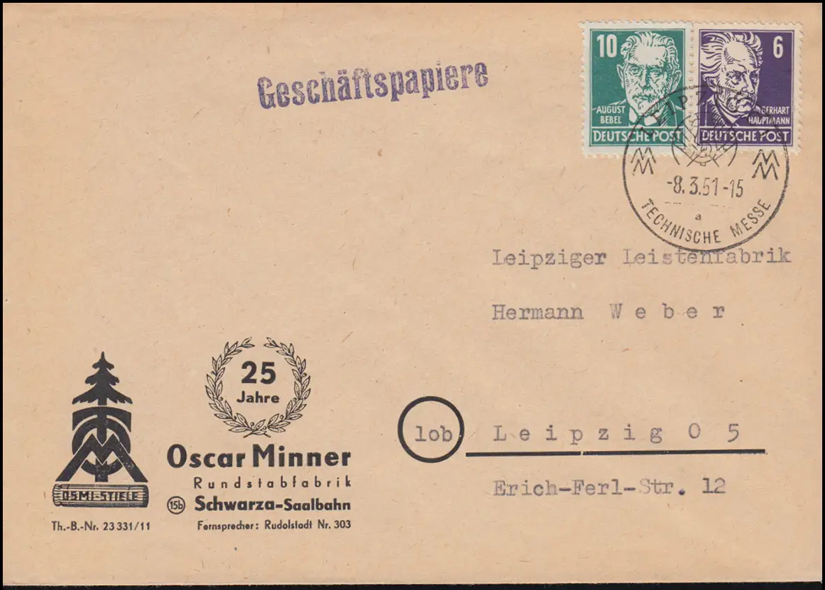 Francophone mixte à la main sur lettre locale / documents commerciaux de la société Oscar Minner / Rundstafabrik in Schwarza-Salbahn an die Leipziger Aristenführfälder, Spécial Tampon technique Messe 8.3.51 / Figure Logo du plan quinquennal et 2 x Messelogo Numéro de catalogue: 213+215 Examen: original Référence d'article: 00000000043360