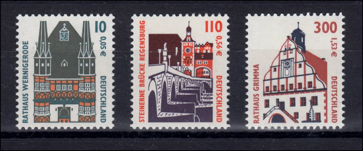 Doppelnominale D-Mark und Euro - Rathaus Wernigerode / Steinerne Brücke Regensburg / Rathaus Grimma