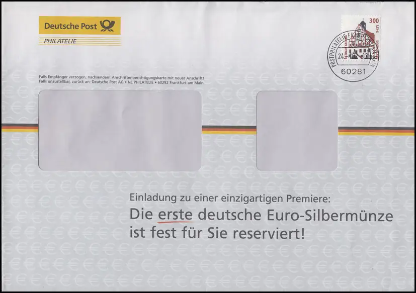 2141 SWK Hôtel de ville Grimma 300 Pf EF Lettre publicitaire Euro-Pièce d'argent FRANKFURT 24.1.02