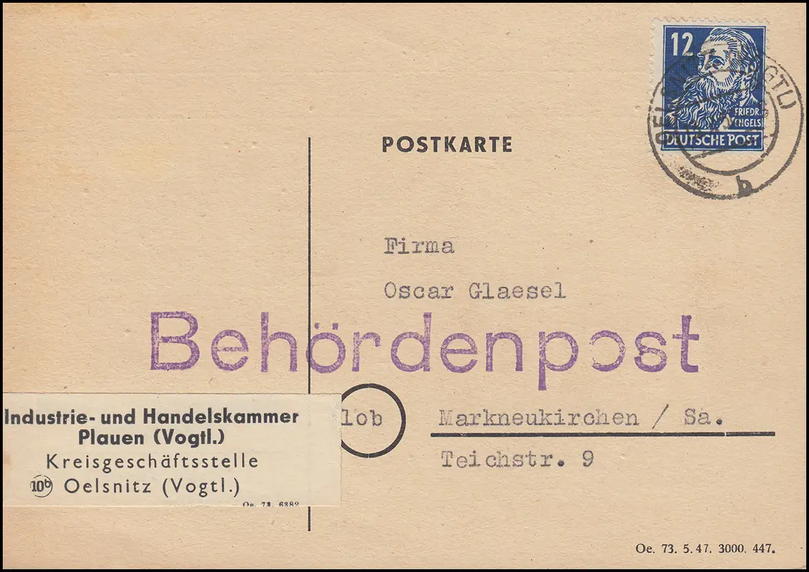 216 Engels 12 Pf. Post de porto approprié carte postale OELSNITZ / VOGTL. 13.7.50