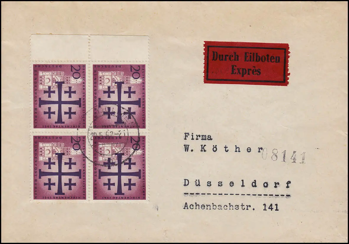 216 Journée de l'église 20 Pf Rand-Quaterblock MeF portofestige Eil-Bf. SUNDERN 29.5.62