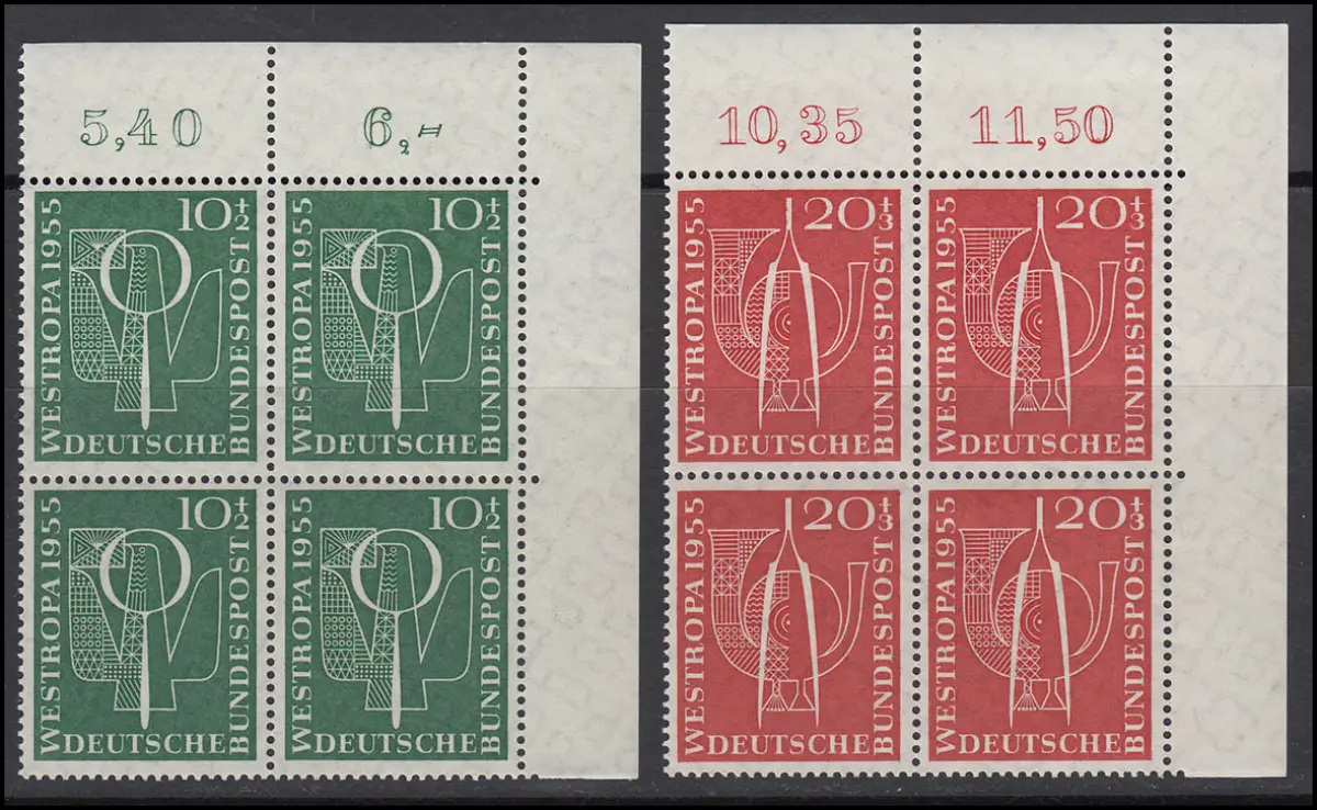 217-218 Ausstellung WESTROPA jeweils Eck-Viererblock oben rechts, ungefaltet **