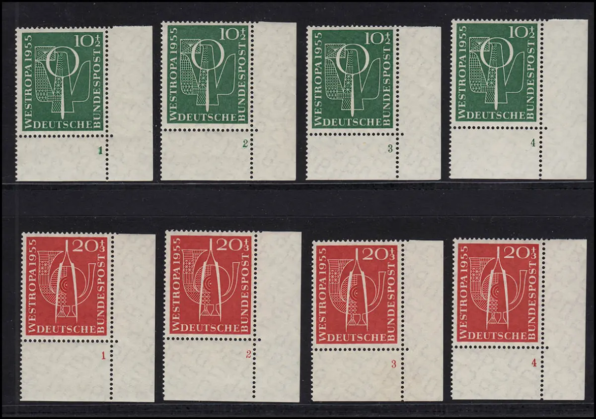 217-218 Ausstellung WESTROPA jeweils mit allen Formnummern 1-4, ungefaltet **