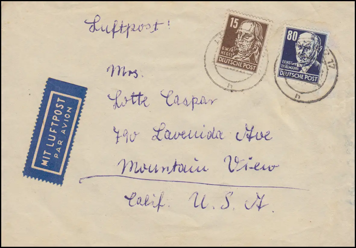 217 Hegel et 226 Thälmann Lp.-Externalsbrief LEIPZIG 1952 vers les États-Unis BPP-testé