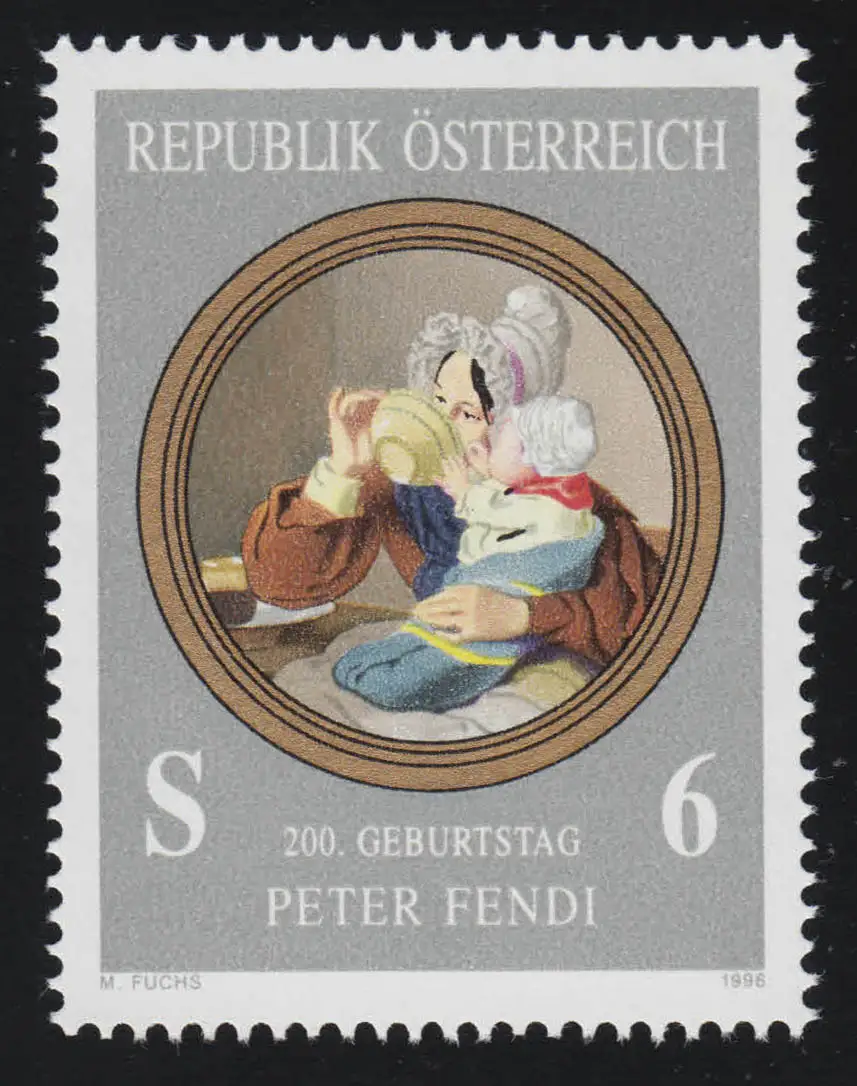 2181 peintre: Anniversaire Peter Fendi, mère avec enfant miniature, 6 S, frais de port **