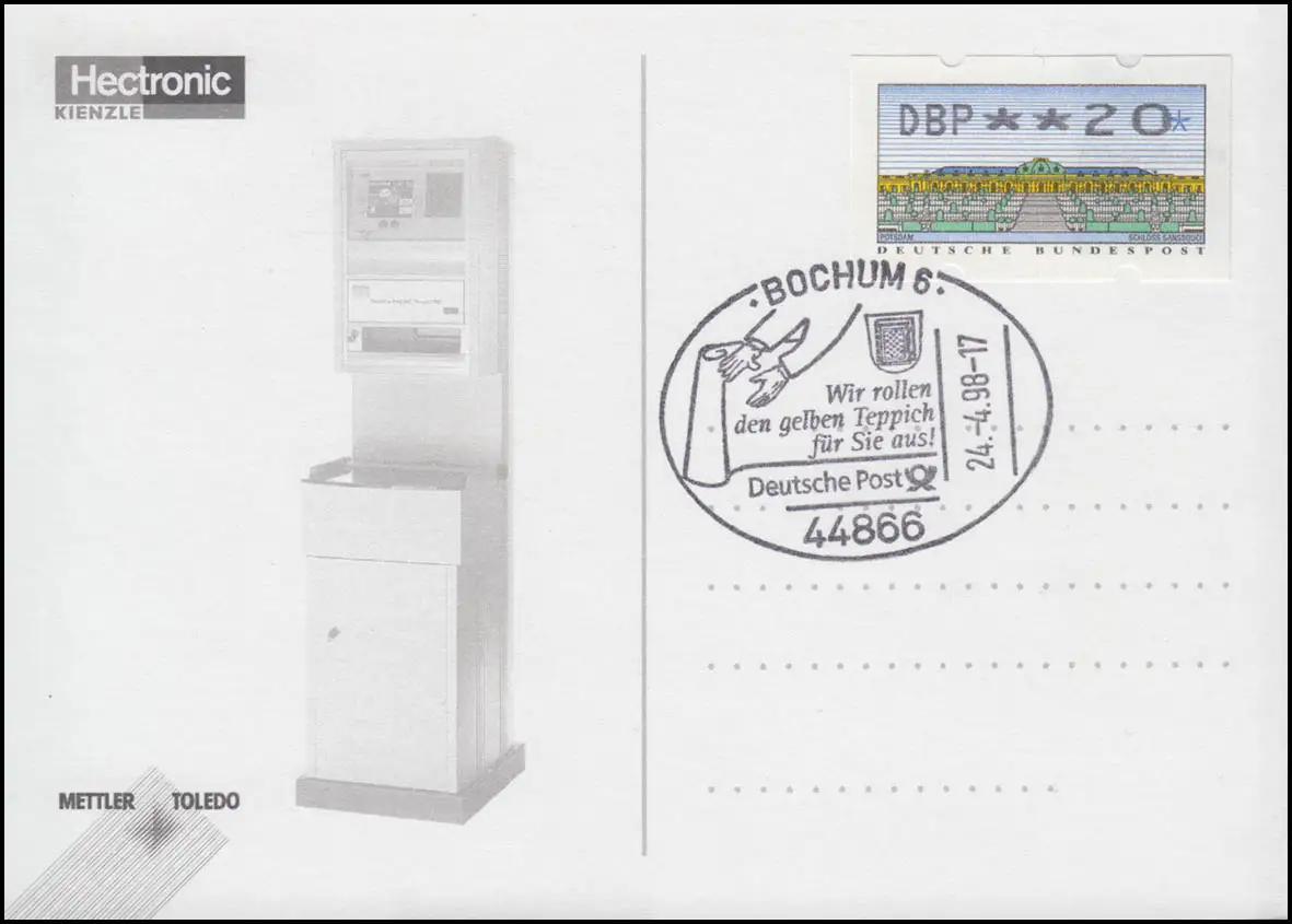 2.2.2 METTLER PIA Marque unique sur carte spéciale ESSt BOCHUM 24.4.1998 avec reçu