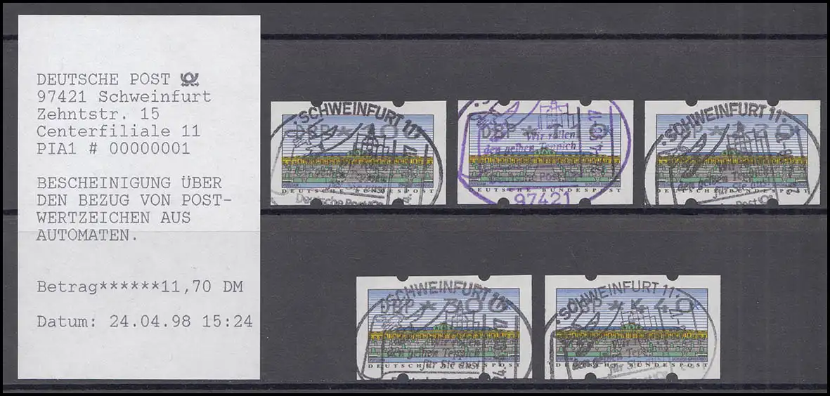 METTLER - le type le plus rare de la 2e édition en set post-frais avec cinq niveaux (100, 110, 220, 300, 440 pf.) tous avec un tampon spécial de premier jour SCHWERFURT 24.4.98 et avec reçu de porc en furte du 1er jour 24.04.1998 N° de catalogue: 2.2.2 Vérification: original Numéro d'article: 00000000005354>Note: Cet article n'est disponible qu'une seule fois. Vous recevrez exactement l'élément représenté.