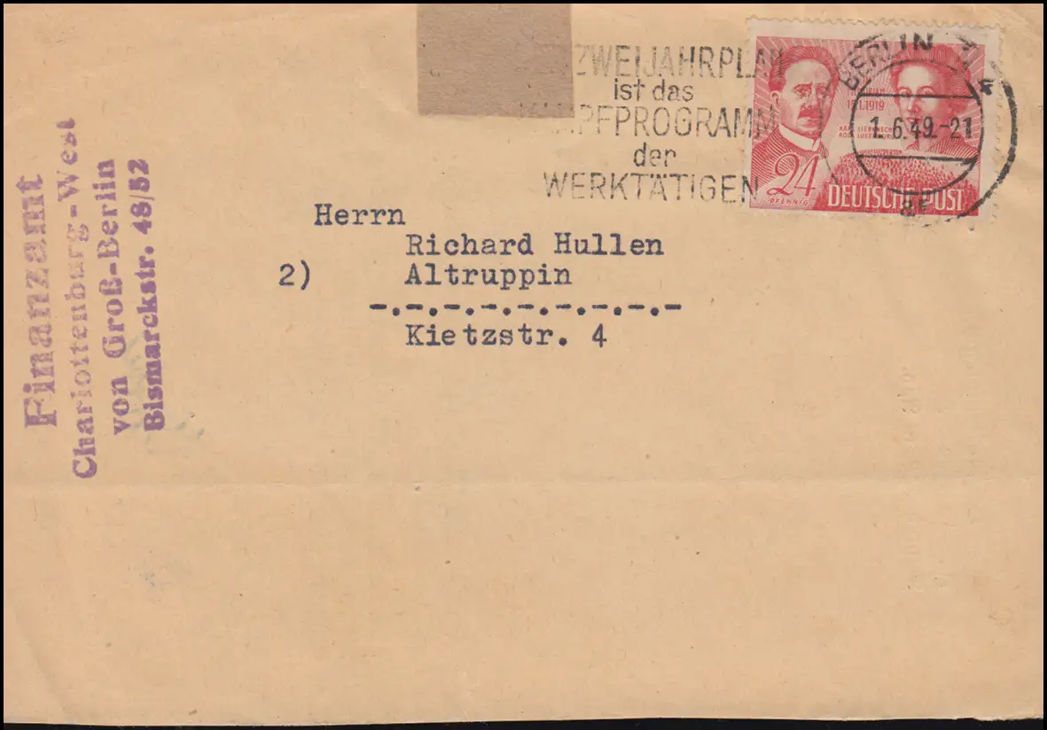 229 Liebknecht et Luxembourg 24 Pf sur le porte-monnaie BERLIN 1.6.1949 vers Altruppin