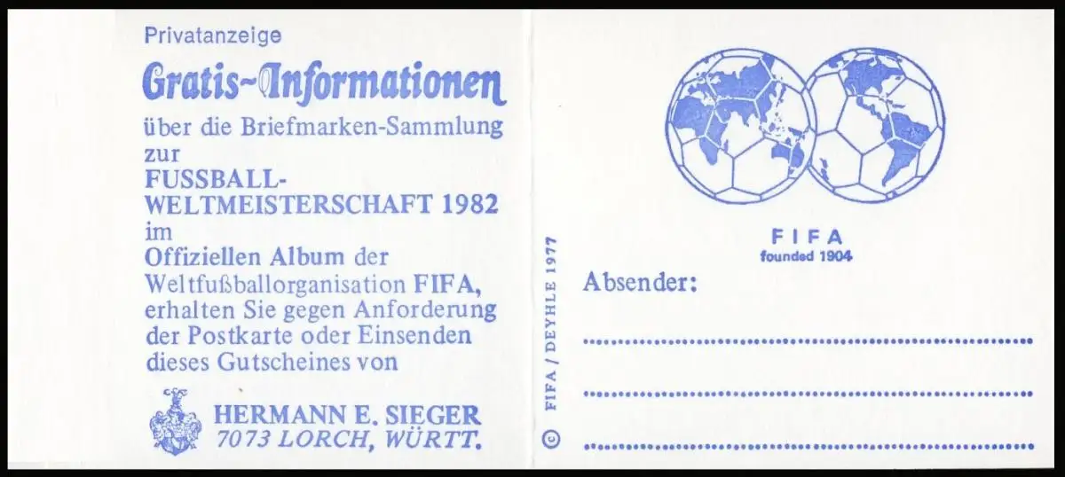2 Adresses, vainqueur/FIFA; variante a: i de la valeur postale est à gauche du premier l de l'expéditeur, avec barres de comptage, frais de port N° de catalogue: 22Id Vérification: original Référence produit: 50020002204102>p>Attention: Cet article est ou a été multiple. La figure montre un de ces articles exemplaire. Le nom de marque fourni a uniquement les caractéristiques indiquées dans la description et peut donc différer de celle-ci. Toutefois, en particulier pour les marques marquées, nous nous efforçons de fournir l ' article illustré. Si cela est une condition pour vous, veuillez nous le faire savoir.