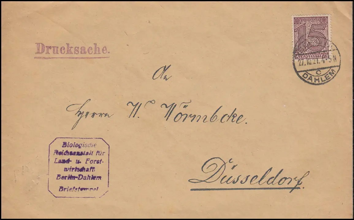 Envoi individuel à la charge du port sur papier avec cachet "Biologische Reichsanstalt für Land- und Forstwirtschaft Berlin-Dahlem" vers Düsseldorf N° de catalogue: D25 Examen: original Référence produit: 00000000024363>p>Note: Cet article n'est disponible qu'une seule fois. Vous recevrez exactement l'article représenté.