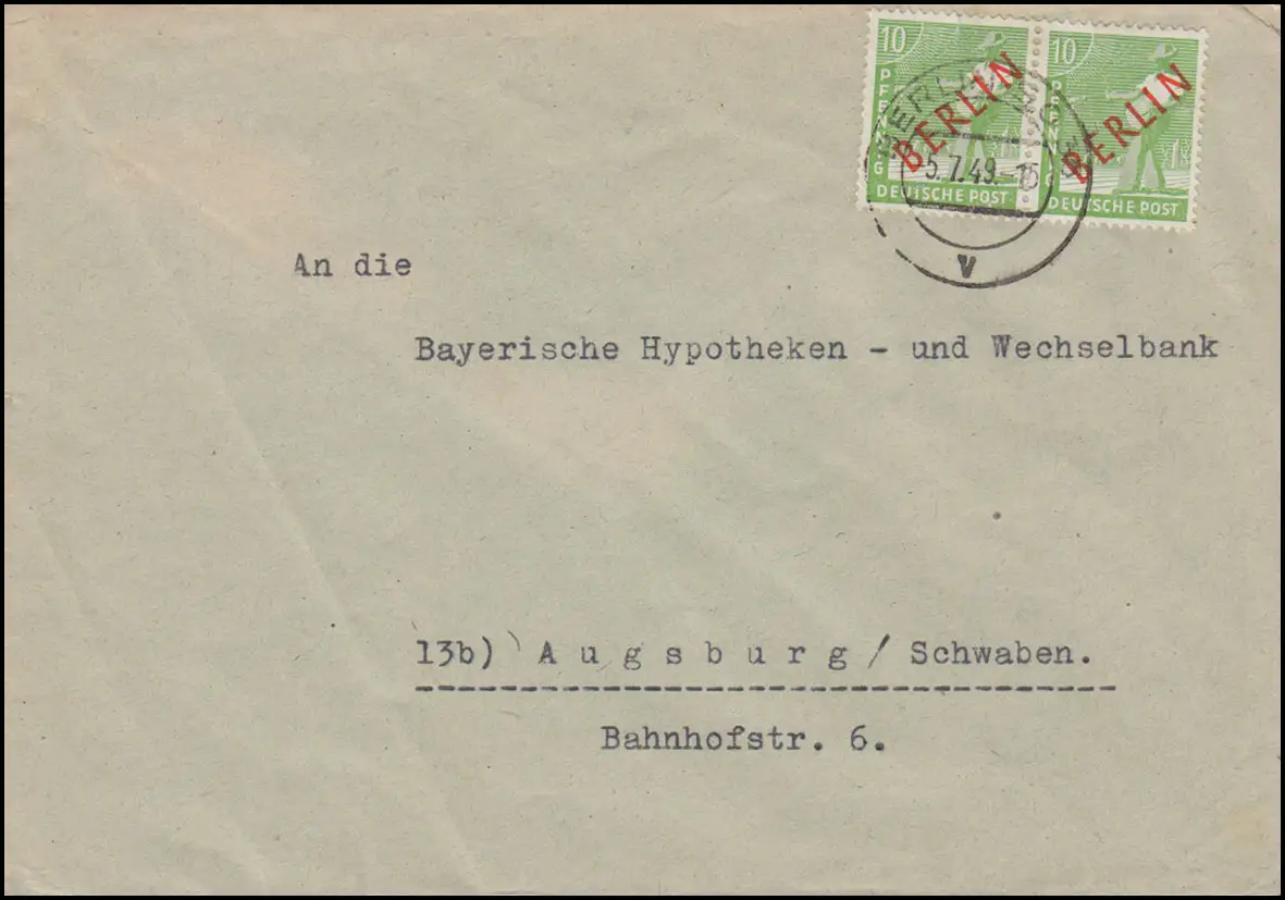 24 Rouge 10 pfennig en couple sur lettre BERLIN 5.7.1949 n. Augsburg