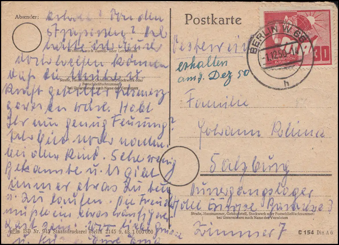 250 Journée du Travail 1er mai 30 Pf EF sur carte postale BERLIN 1.12.1950 à Salzbourg