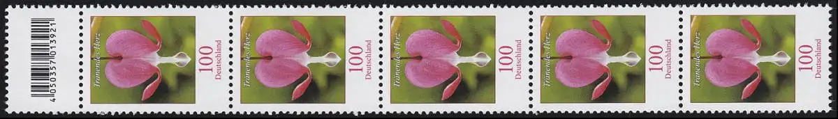 2547 Fleurs 100 cents en rouleau de 200, bandes de 5 avec champ de code **