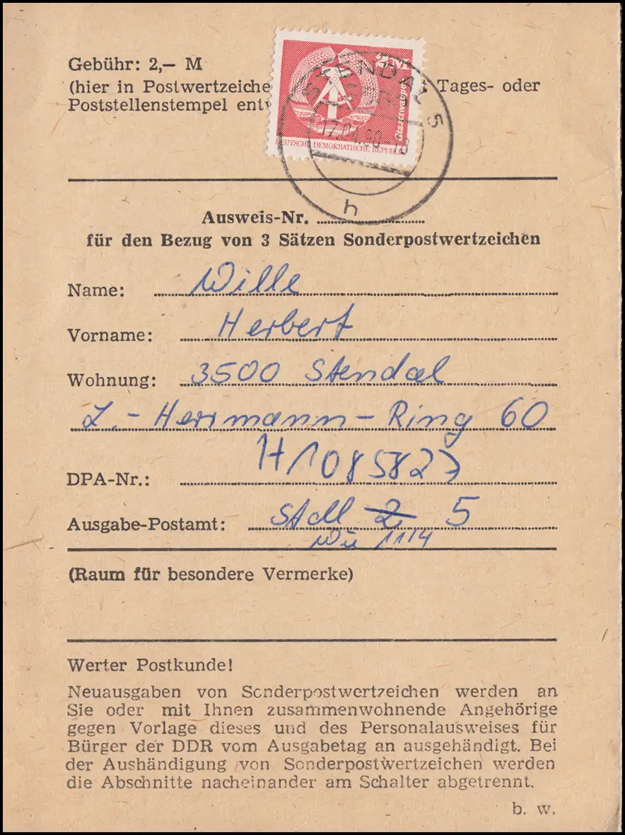 2550 Construction petite 2 marks sur carte de collection DDR pour 3 phrases, STENDAL 17.4.1990