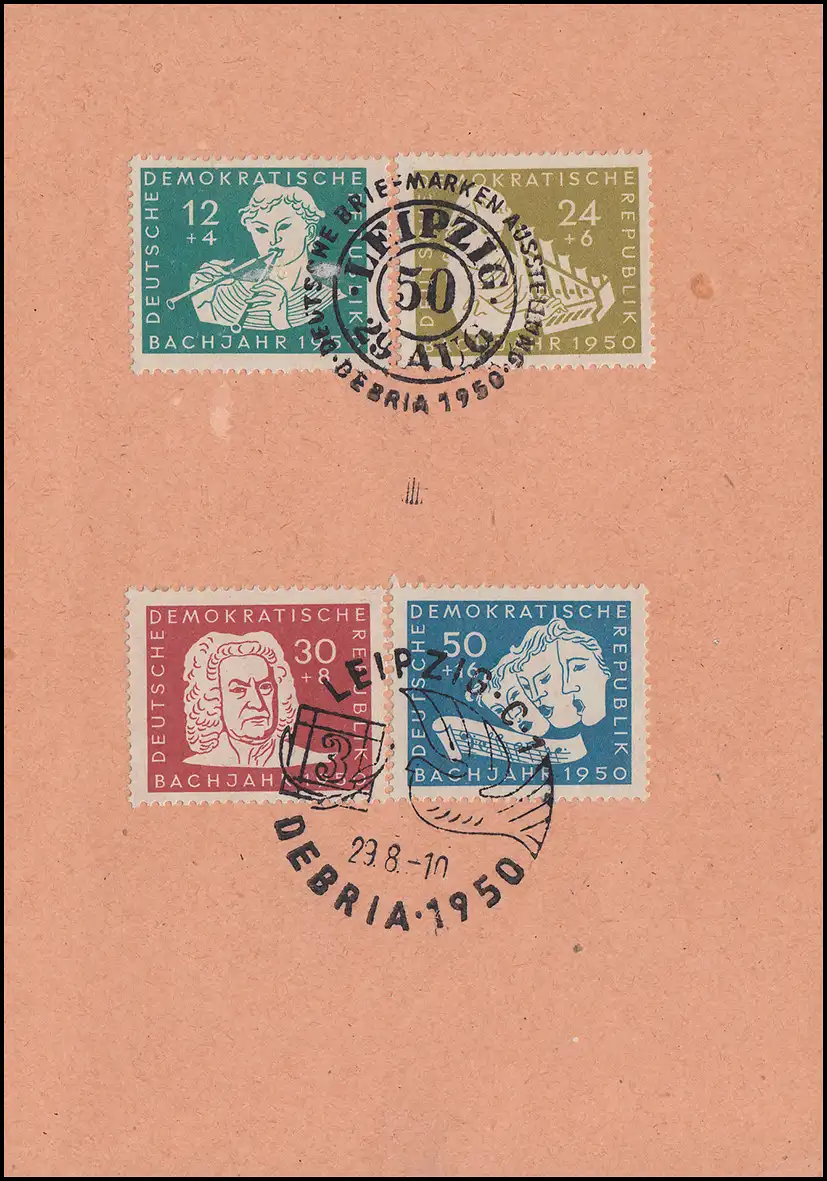 256-259 Bach 1950, jeu sur carte de cachet avec deux SSt LEIPZIG DEBRIA 29.8.50