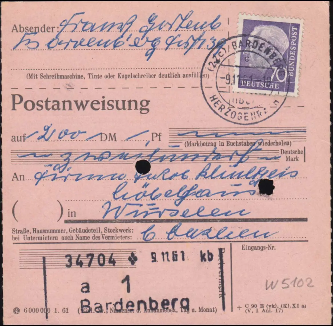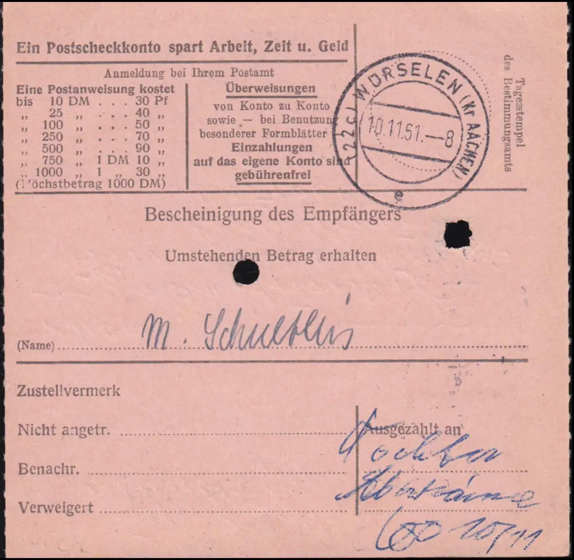 Tampon d'arrivée WURSELEN (Kr. ACHEN) 10.11.61, avec perforation Numéro de catalogue: 263 Examen: original Référence produit: 00000000035087>p>Note: Cet article n'est disponible qu'une seule fois. Vous recevrez exactement l'article représenté.