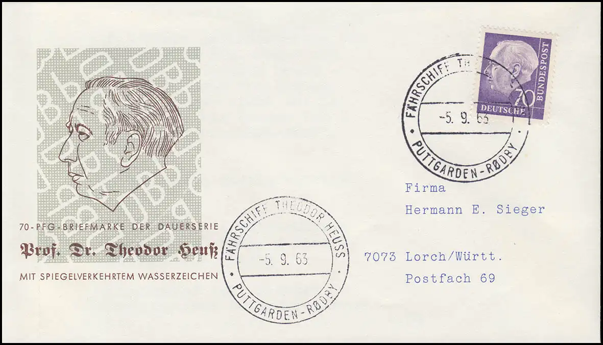 263xwZ Heuss 70 Pf. Filigrane à mi-chemin vers le haut sur lettre