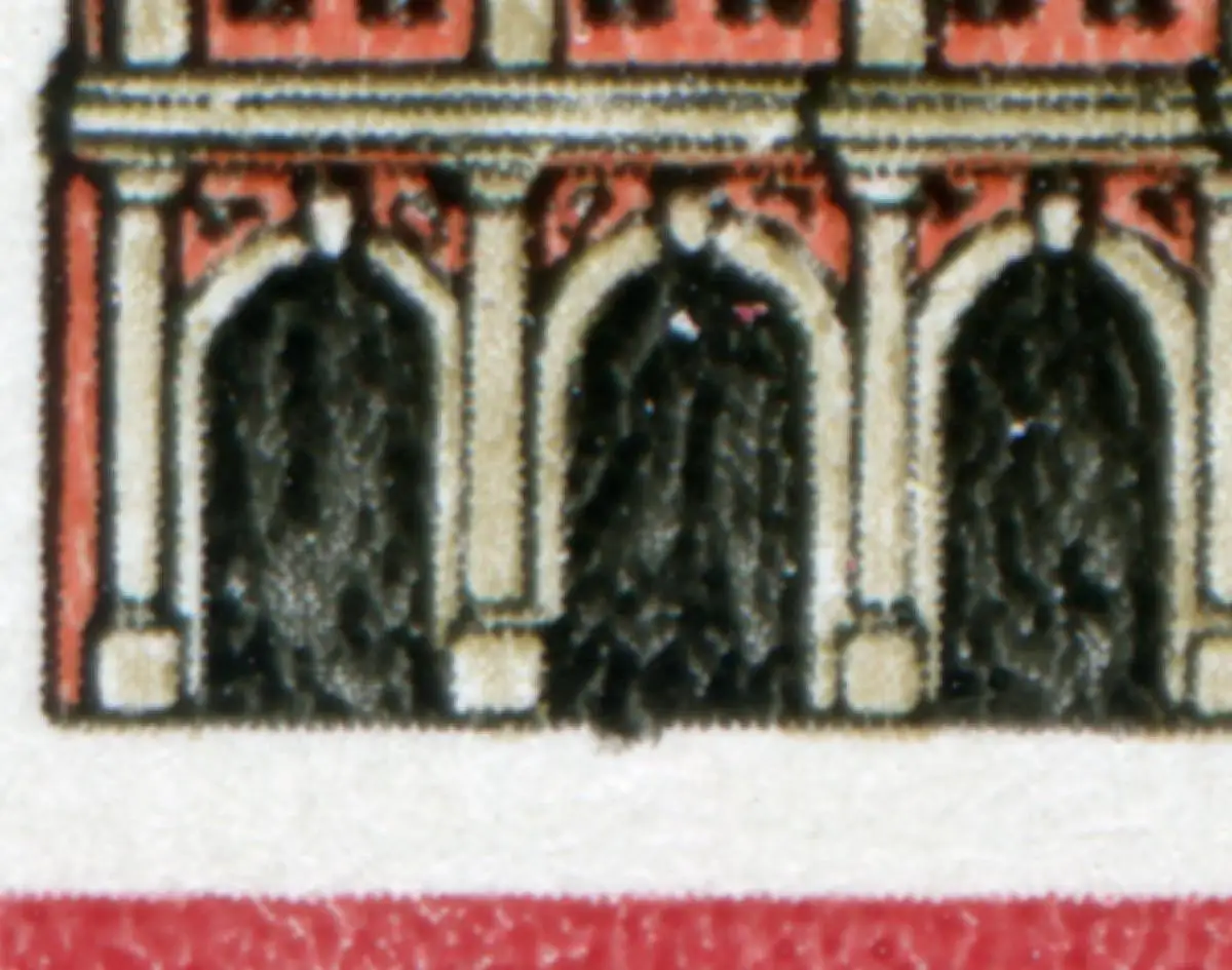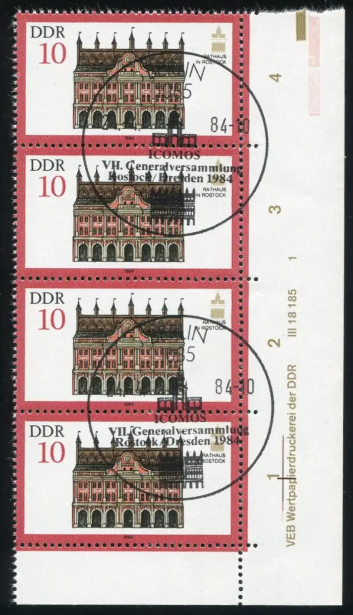 Bande verticale de 4ers d'angle avec impression et défauts de plaque sur la case 40: remblayage noir au deuxième passage de gauche, timbre spécial de premier jour Berlin ICOMOS-Assemblée générale 24.4.1984 Numéro de catalogue: 2869 Examen: original Référence produit: 00000000002020