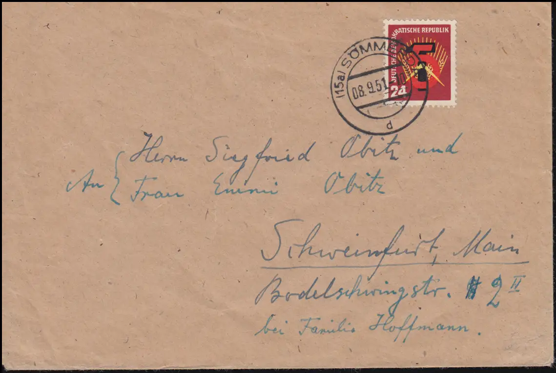 293 Plan quinquennal 1951 en tant qu'EF sur lettre SÖMMERDA 8.9.51 vers Schweinfurt / Main