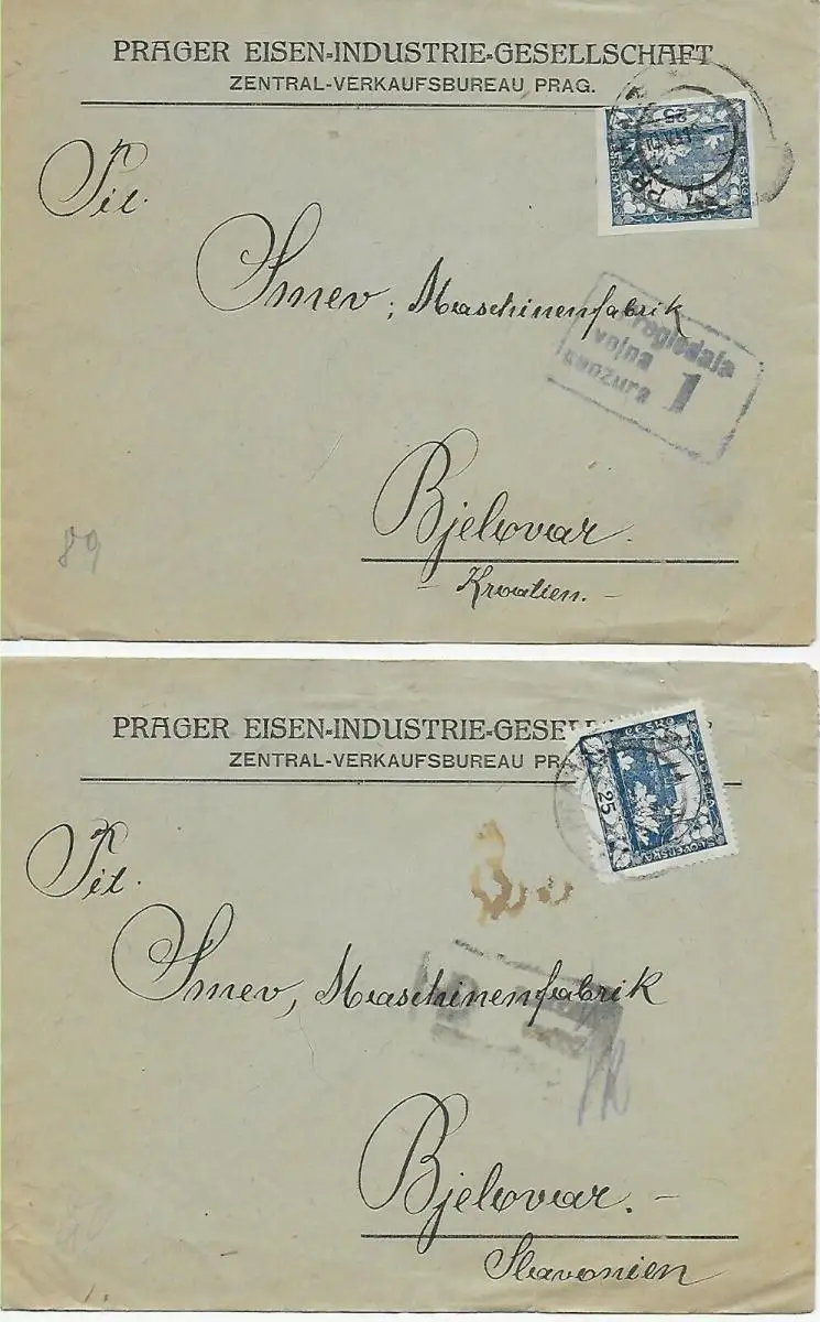 2x Lettres de la Société sidérurgique de Prague à Bjelovar