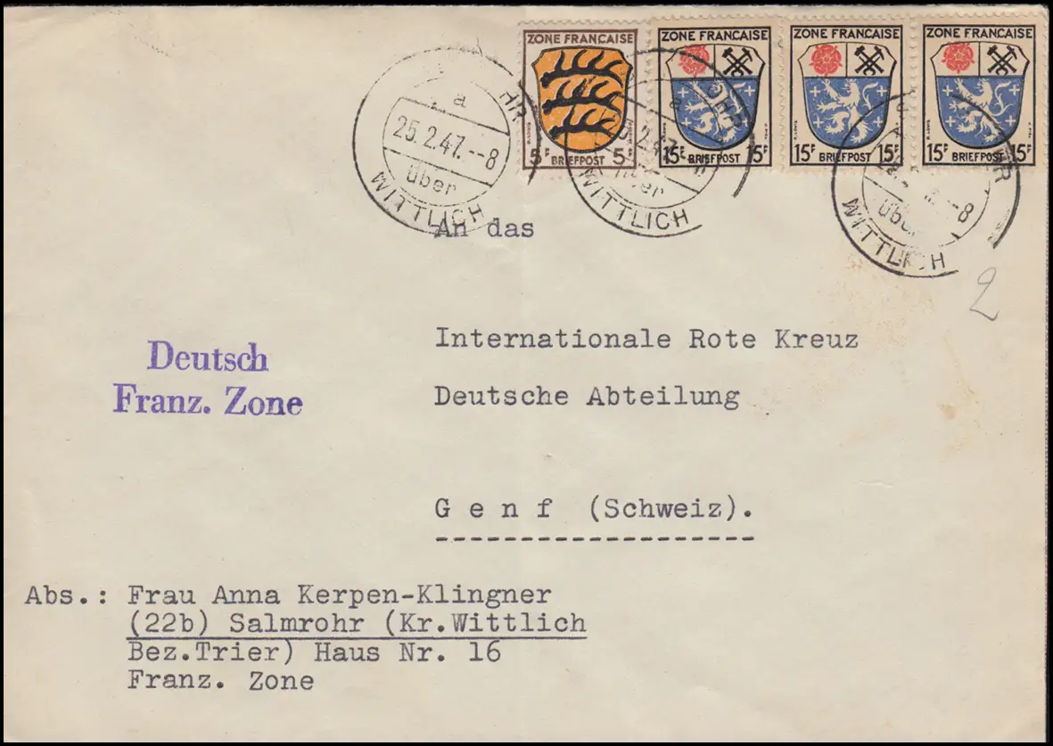 3+7 francs armoiries 5+15 Pf MiF Lettre étrangère SALMROHR sur WITTLE 25.2.1947