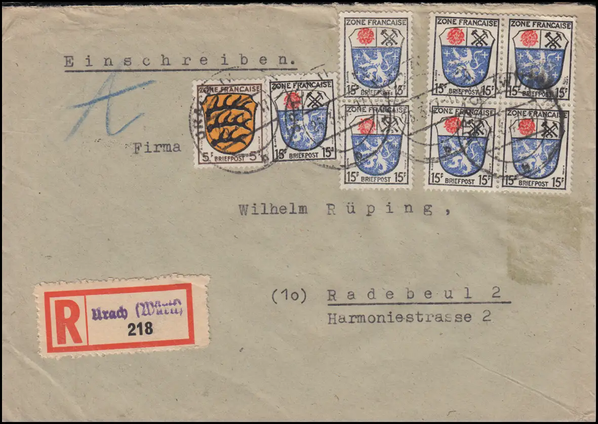 3+7 francs blagues 5+15 pf. sur lettre R URACH (WURTT.) 25.3.47 vers Radebeul