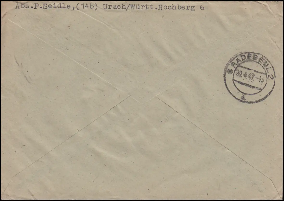 avec le cachet d'arrivée RADEBEUL 20.4.47 Numéro de catalogue: 3+7 Vérification: original Référence produit: 00000000021607>Note: Cet article n'est disponible qu'une seule fois. Vous recevrez exactement l'article représenté.